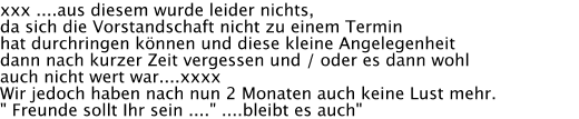Es ist uns bewusst das sich eine Vereinsführung nicht nach einzelnen richten kann, sondern für die breite Masse gewappnet sein muss. Das ein Verein auch durch seine ehrenamtlichen Helfer steigt und fällt ist uns auch bewusst, das Ansehen jedoch ebenfalls. Wir kommen uns jedoch nach dem doch recht eindrucksvollen Vorstellungsgespräch und der Aufgabenstellung des neuen Grundkurses jedoch jetzt relativ verarscht vor.